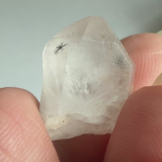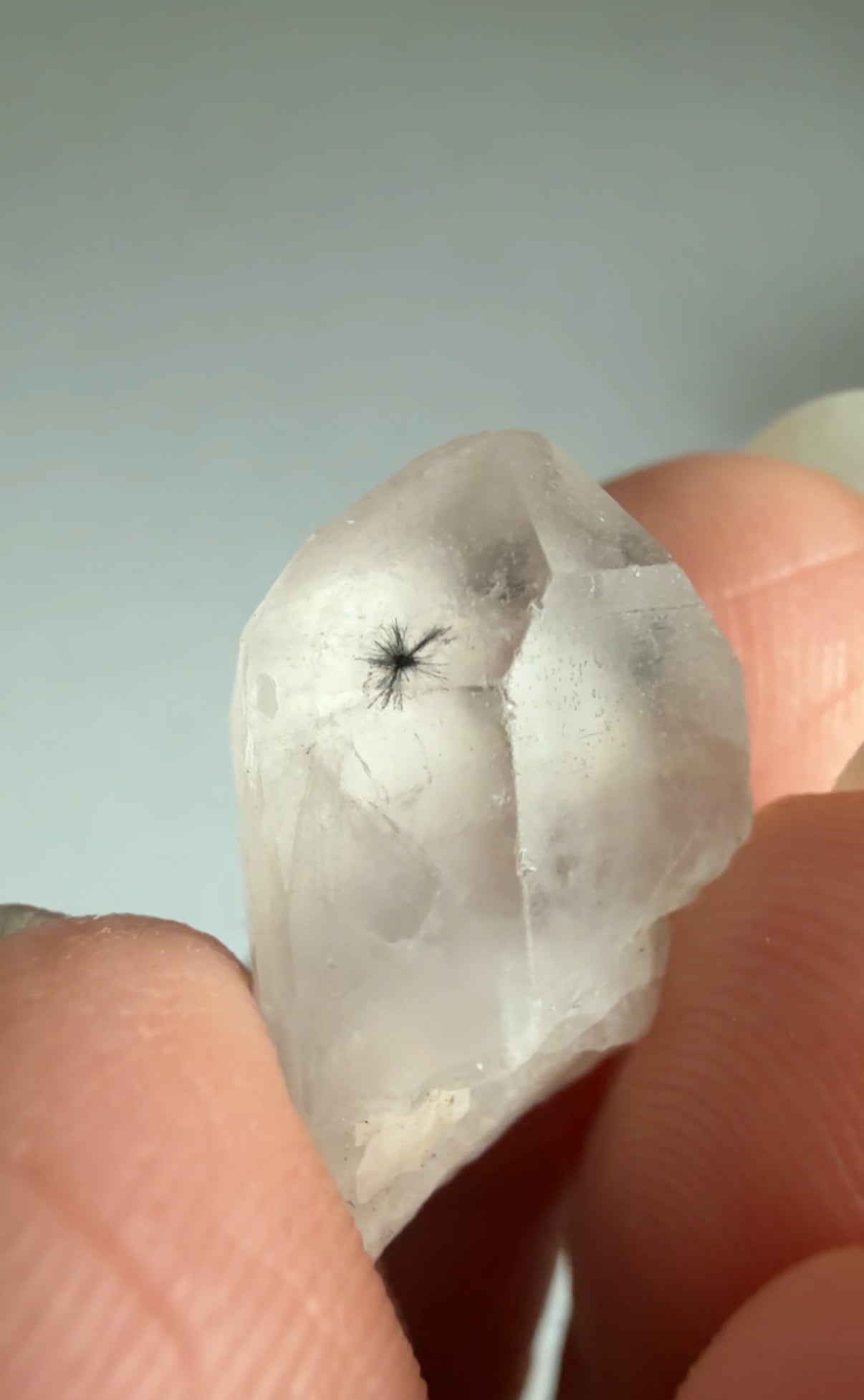 An aesthetic little thumbnail specimen with two little well defined bursts of hollandite in quartz.